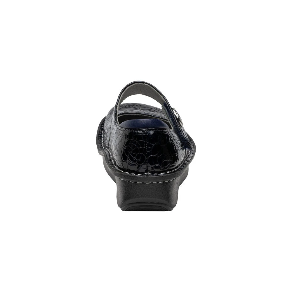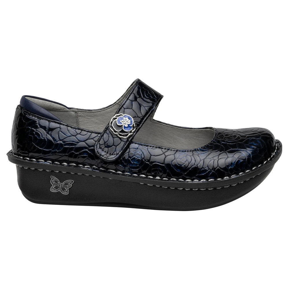 A timeless style with an Alegria twist, the Paloma is the perfect shoe for any occasion. This easy-fit Mary Jane features a beautiful Moody Blues embossed genuine leather with a glossy patent finish, and ornamented with a unique button on the strap.