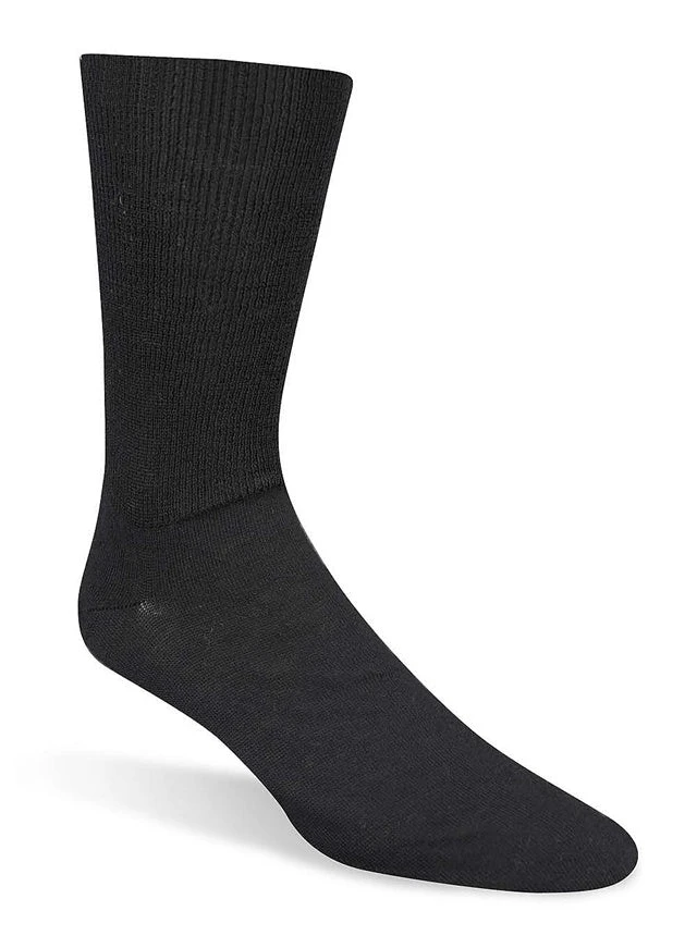 A crew sock with moisture wicking fiber and non-binding leg and foot.