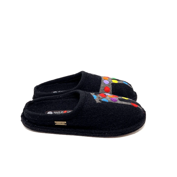 “Here Jacky boy!” is what your feet will be saying to the Haflinger Jack slippers. Adorned with a wool cutout of a colorfully spotted pup – upper body on your right foot and tail on your left foot – the Jack is sure to become your new best friend for your feet. The boiled wool upper and lining is not only super soft and cuddly, but the natural fiber will keep your feet at a constant temperature by wicking away the moisture while acting as a natural insulator. That means keeping warm in cold weather, and cool in warm weather! The latex molded midsole provides structure and arch support for comfort where you need it most. The outsole is double-felted to give you some extra cushion with each step, and durability for long-time wear. Fetch a pair of the Haflinger Jack slippers today!